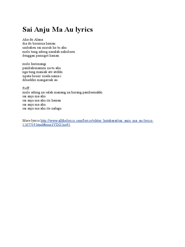 Lirik Lagu Batak Sai Anju Ma Au from www.gobatak.com Ketikkan nama penyanyi dan judul lagu, berikan tanda kutip di judul lagu, misal: Em a anju ma au haholongan am d dihahurangan hi. Molo adong na sala manang na hurang pambahenan ki sai anju ma au, sai anju ma au ito hasian sai anju ma au, sai anju ma au ito nalagu. Aug 02, 2011 · new pop batak karaoke | lirik lagu batak: Umbahen sai muruk hotu au molo tung adong nasalah nahubaen denggan pasingot hasian. Em a anju ma au haholongan d dihahurangan hi. Molo tung adong nasalah nahubaen denggan pasingot hasian molo hurimangi pambahenammi na tu ahu nga tung maniak ate atekki sipata bossir soada nama i dibaekko mangarsak ah reff : More images for lirik lagu molo adong nasala i denggan pasingot hasian »